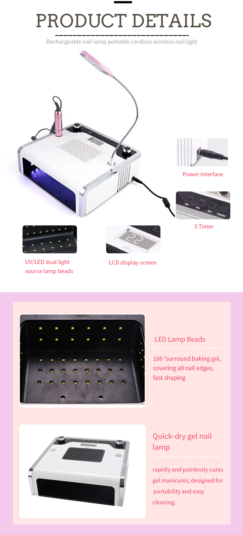 4-i-1 multifunktions nagellampa säkerställer jämn limtorkning utan att krympa. Dess dubbla ljuskällor ger skonsam uppvärmning för att förhindra missfärgning av händerna och ansträngda ögon, lämplig för både händer och fötter, vilket ger anmärkningsvärt snabbtorkande resultat.