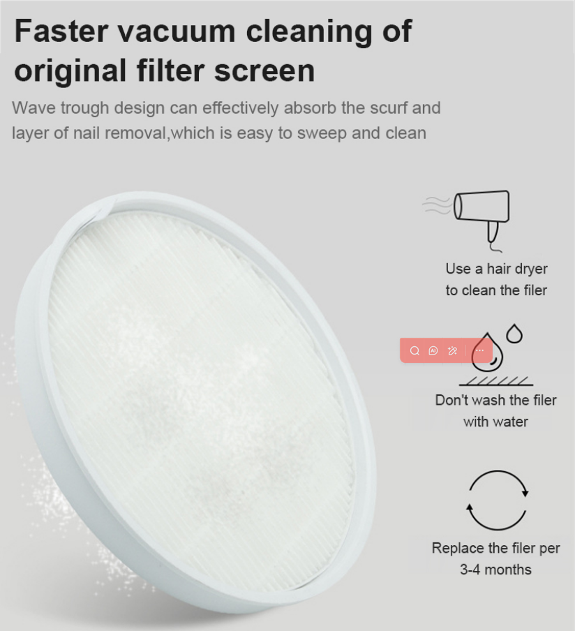 1, dammsamlarfilter, ny design, lätt att rengöra.