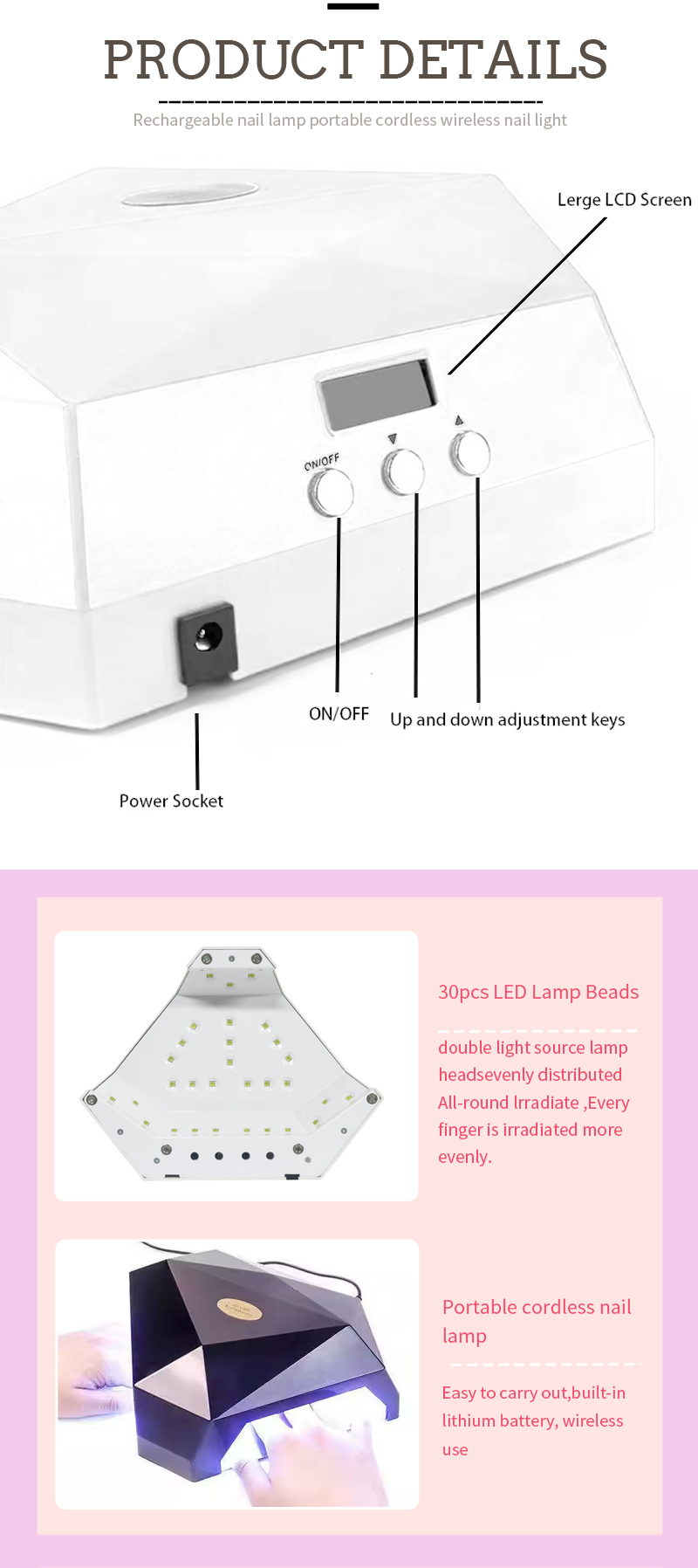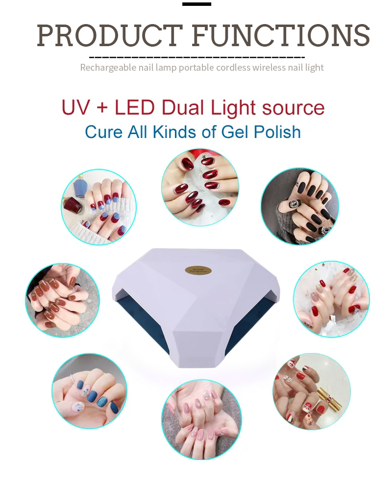 Produkten säkerställer till och med limtorkning utan krympning. Dess dubbla ljuskällor ger mild uppvärmning för att förhindra missfärgning av handen och ögonstränningen, lämplig för både händer och fötter, vilket ger anmärkningsvärt snabbtorkningsresultat.