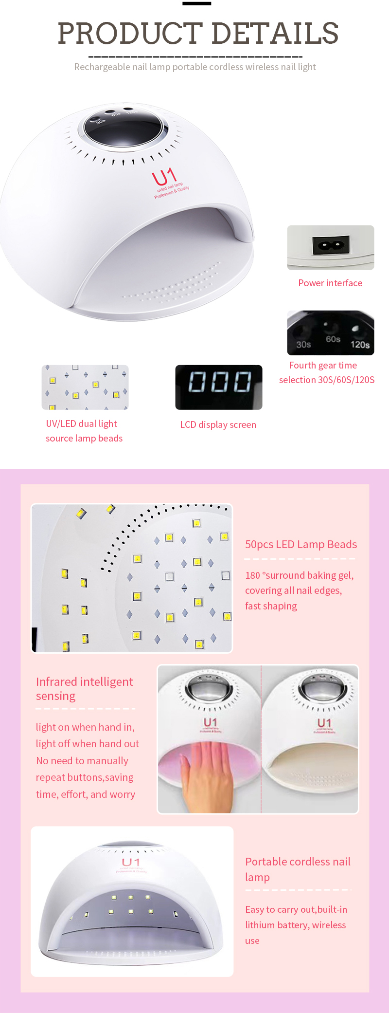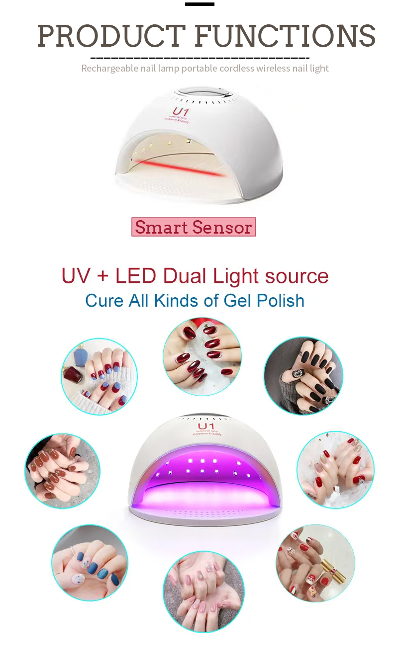 Produkten säkerställer en jämn limtorkning utan att krympa. Dess dubbla ljuskällor ger skonsam uppvärmning för att förhindra missfärgning av händerna och ansträngda ögon, lämplig för både händer och fötter, vilket ger anmärkningsvärt snabbtorkande resultat.
