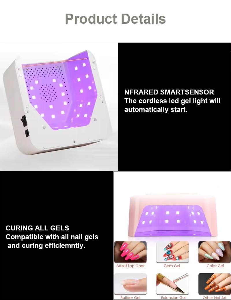 Denna högkvalitativa gelnagellack snabbtorkande lampa säkerställer en jämn limtorkning utan att krympa. Dess dubbla ljuskällor ger skonsam uppvärmning för att förhindra missfärgning av händerna och ansträngda ögon, lämplig för både händer och fötter, vilket ger anmärkningsvärt snabbtorkande resultat.