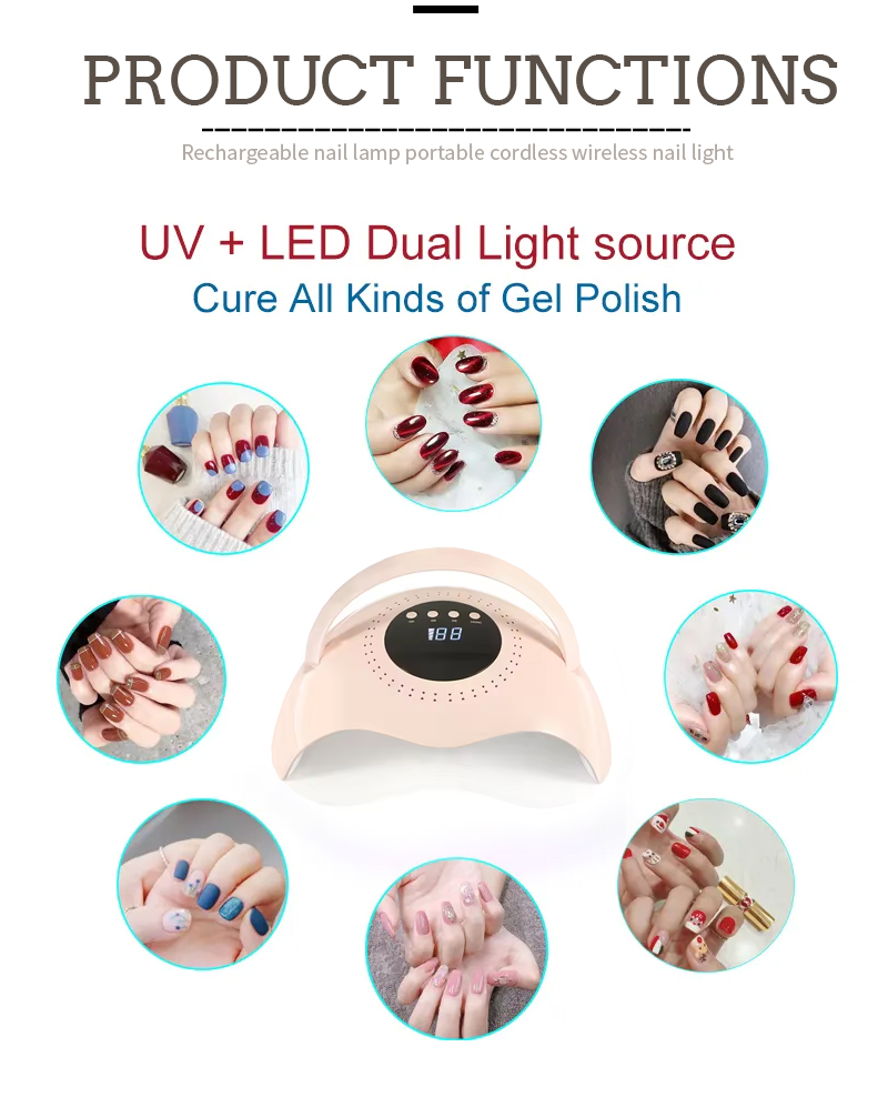 Produkten säkerställer en jämn limtorkning utan att krympa. Dess dubbla ljuskällor ger skonsam uppvärmning för att förhindra missfärgning av händerna och ansträngda ögon, lämplig för både händer och fötter, vilket ger anmärkningsvärt snabbtorkande resultat.