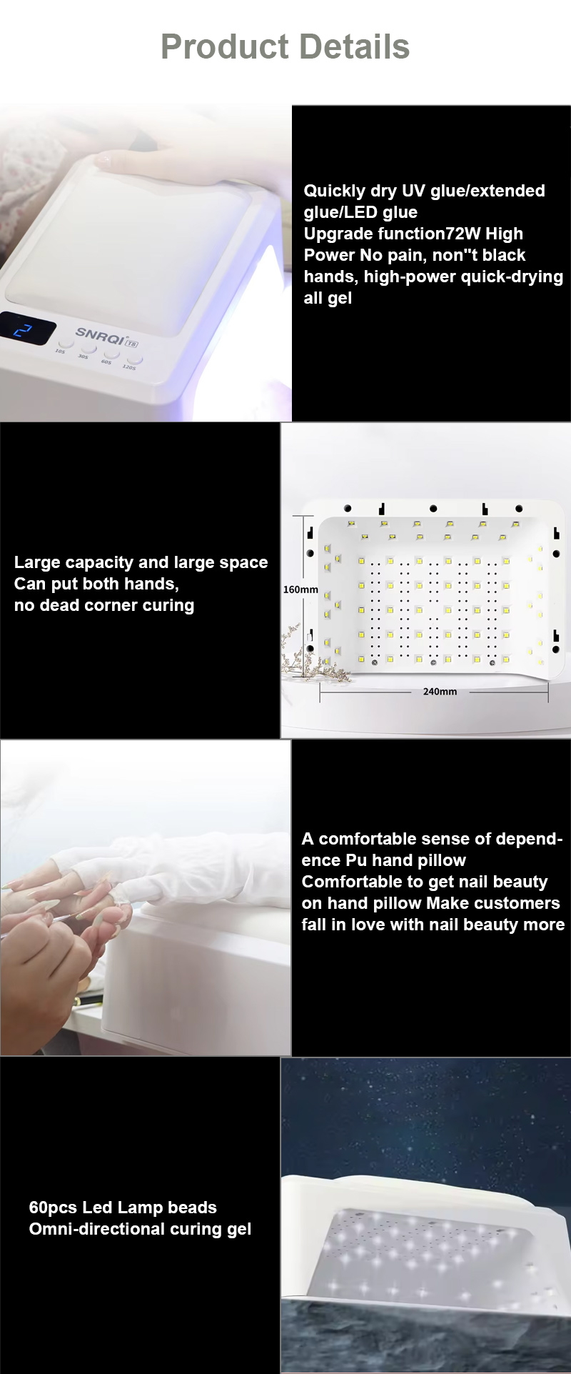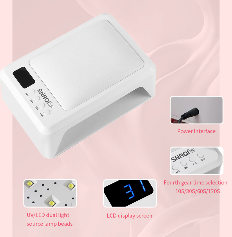Produkten säkerställer en jämn limtorkning utan att krympa. Dess dubbla ljuskällor ger skonsam uppvärmning för att förhindra missfärgning av händerna och ansträngda ögon, lämplig för både händer och fötter, vilket ger anmärkningsvärt snabbtorkande resultat.