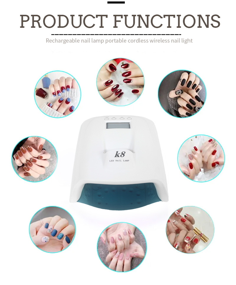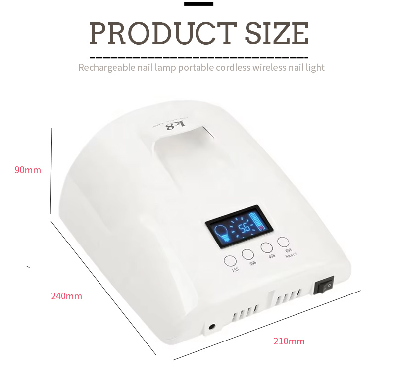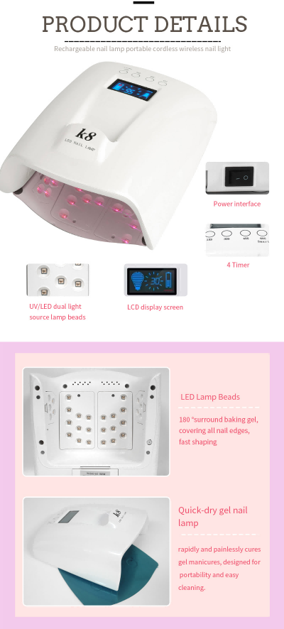 Nageltorklampa med stor kapacitet och handtag säkerställer en jämn limtorkning utan att krympa. Dess dubbla ljuskällor ger skonsam uppvärmning för att förhindra missfärgning av händer och ansträngda ögon, lämplig för både händer och fötter, vilket ger anmärkningsvärt snabbtorkande resultat.