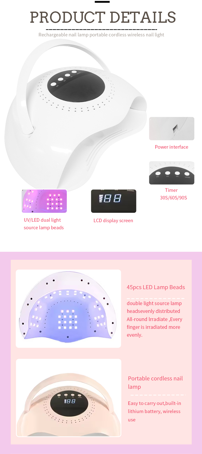 Produkten säkerställer till och med limtorkning utan krympning. Dess dubbla ljuskällor ger mild uppvärmning för att förhindra missfärgning av handen och ögonstränningen, lämplig för både händer och fötter, vilket ger anmärkningsvärt snabbtorkningsresultat.
