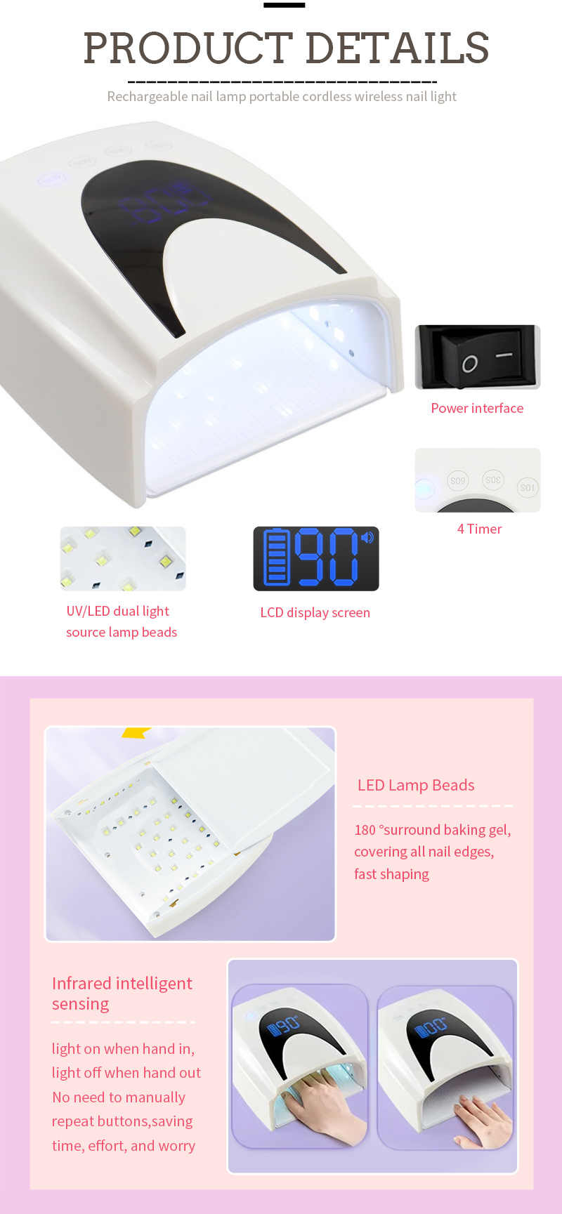 Produkten har en enhetlighet för att limma utan krympande lim, dubbel ljuskälla mild baklim anti-svart hand, skadar inte ögonen, händerna och fötterna kan användas, snabb torkningseffekt är hög.