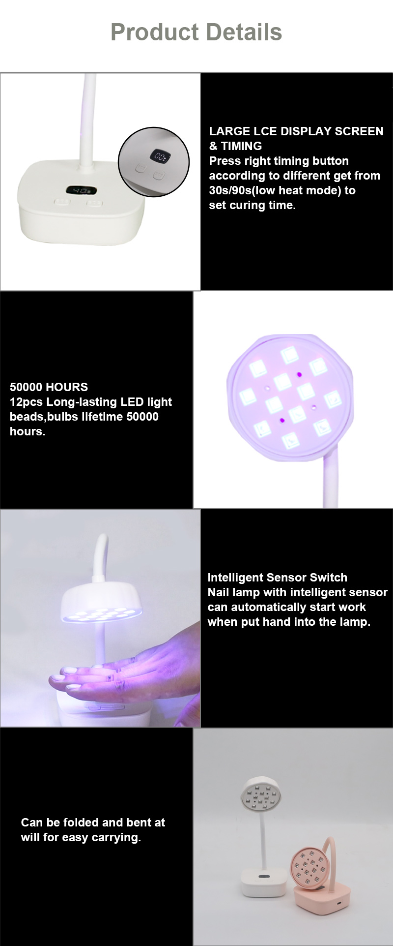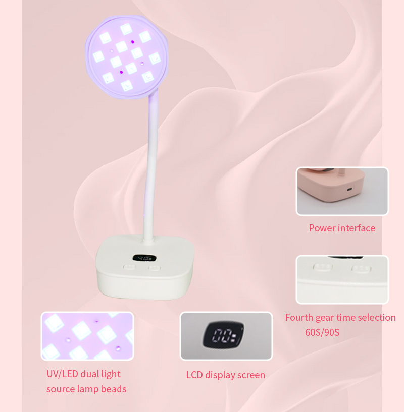 Produkten säkerställer en jämn limtorkning utan att krympa. Dess dubbla ljuskällor ger skonsam uppvärmning för att förhindra missfärgning av händerna och ansträngda ögon, lämplig för både händer och fötter, vilket ger anmärkningsvärt snabbtorkande resultat.