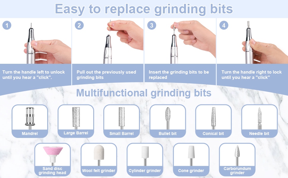 Denna bärbara nagelborrsats med låg ljudnivå har 2 färger att välja mellan, svart/vit/grå/blå/röd/rosa/orange, färgglada färger.
