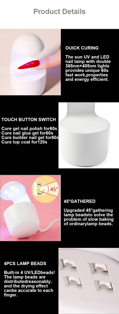 Mini One-Finger Nail Lamp säkerställer en jämn limtorkning utan att krympa. Dess dubbla ljuskällor ger skonsam uppvärmning för att förhindra missfärgning av händer och ansträngda ögon, lämplig för både händer och fötter, vilket ger anmärkningsvärt snabbtorkande resultat.