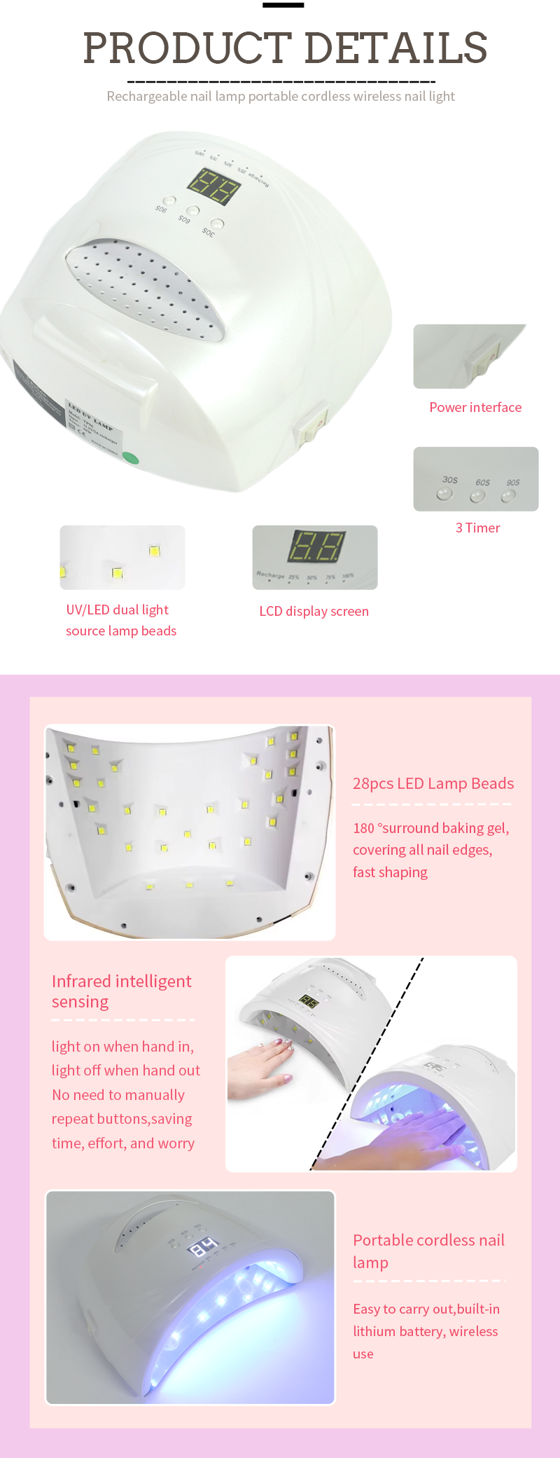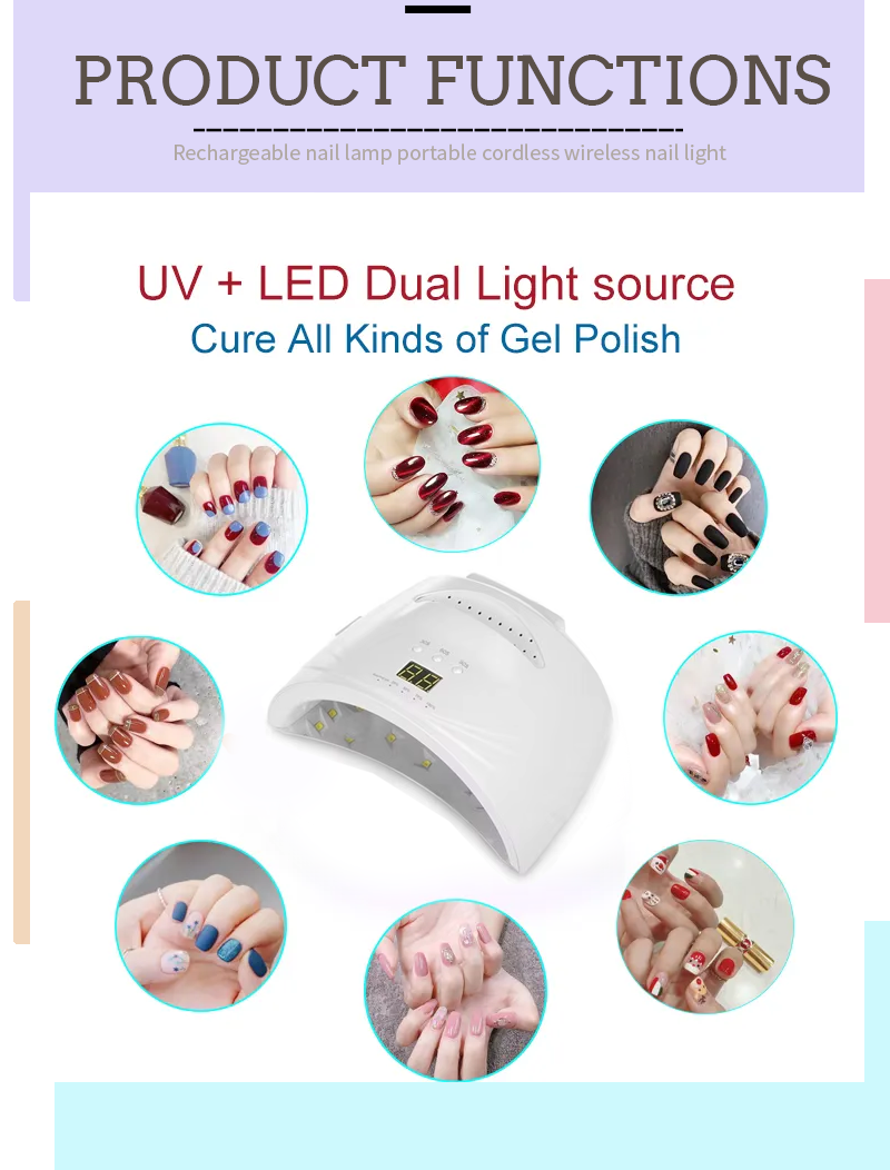 Produkten säkerställer till och med limtorkning utan krympning. Dess dubbla ljuskällor ger mild uppvärmning för att förhindra missfärgning av handen och ögonstränningen, lämplig för både händer och fötter, vilket ger anmärkningsvärt snabbtorkningsresultat.