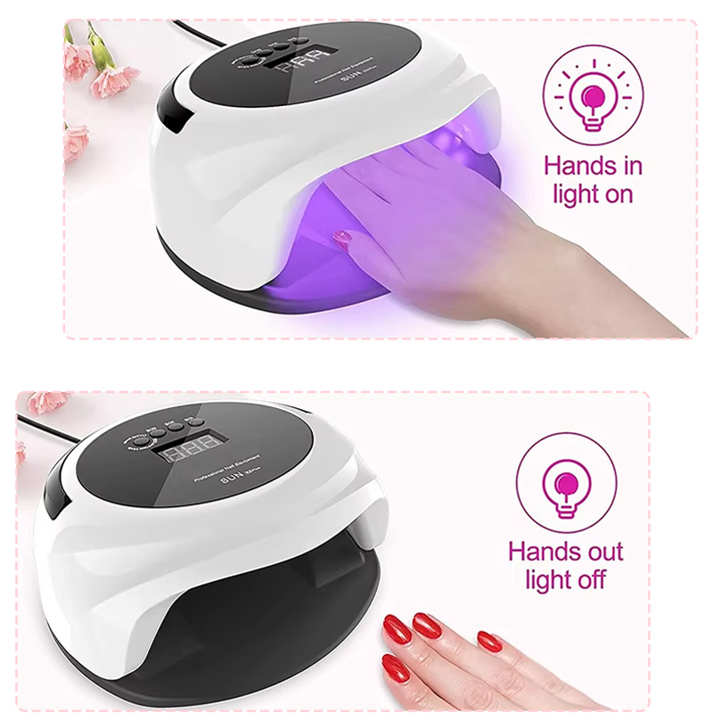 Produkten säkerställer en jämn limtorkning utan att krympa. Dess dubbla ljuskällor ger skonsam uppvärmning för att förhindra missfärgning av händerna och ansträngda ögon, lämplig för både händer och fötter, vilket ger anmärkningsvärt snabbtorkande resultat.