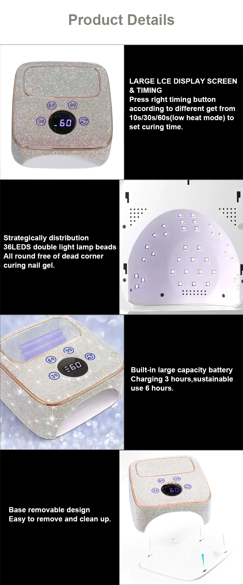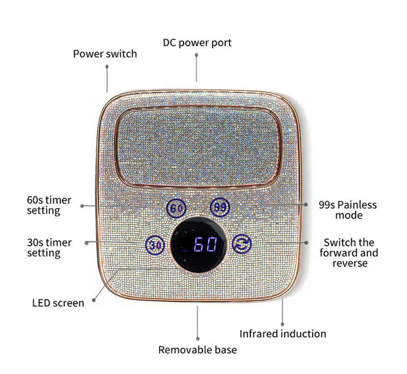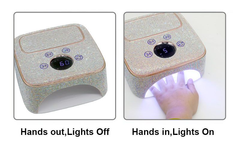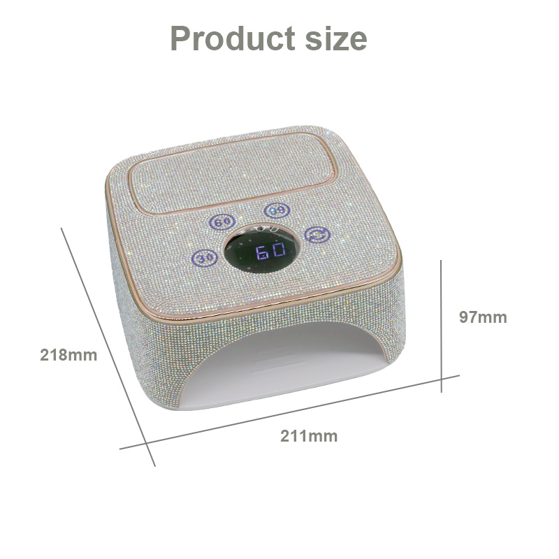 Produkten säkerställer en jämn limtorkning utan att krympa. Dess dubbla ljuskällor ger skonsam uppvärmning för att förhindra missfärgning av händerna och ansträngda ögon, lämplig för både händer och fötter, vilket ger anmärkningsvärt snabbtorkande resultat.