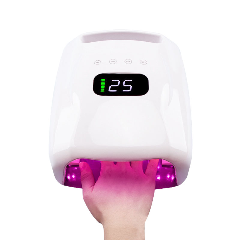 2)Den uppladdningsbara nageltorkarlampan Torkar tummen är inbyggt 28800 mAh högkapacitetsbatteri med stor kapacitet, super uthållighet, laddning 2-3 timmar, kan användas kontinuerligt i upp till 12 timmar, kan lagras ström, kan kopplas ur från nätsladden att använda, mycket bekvämt, mycket rekommenderat för nagelsalonger att använda denna produkt.