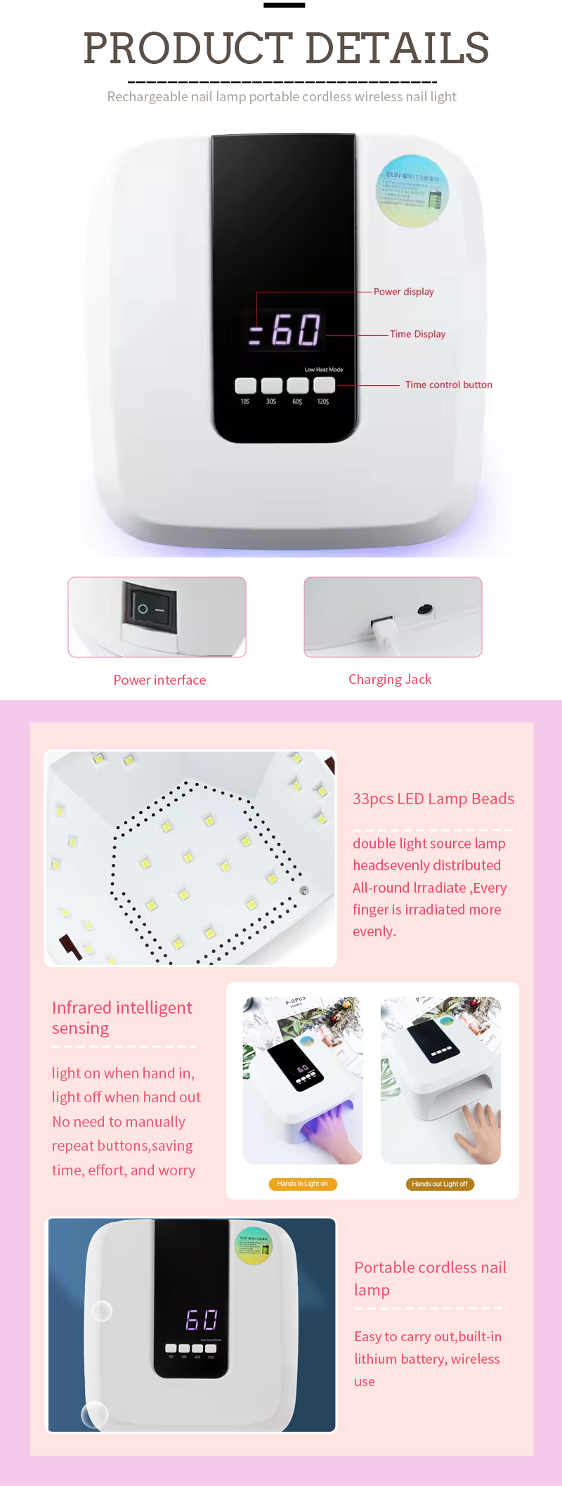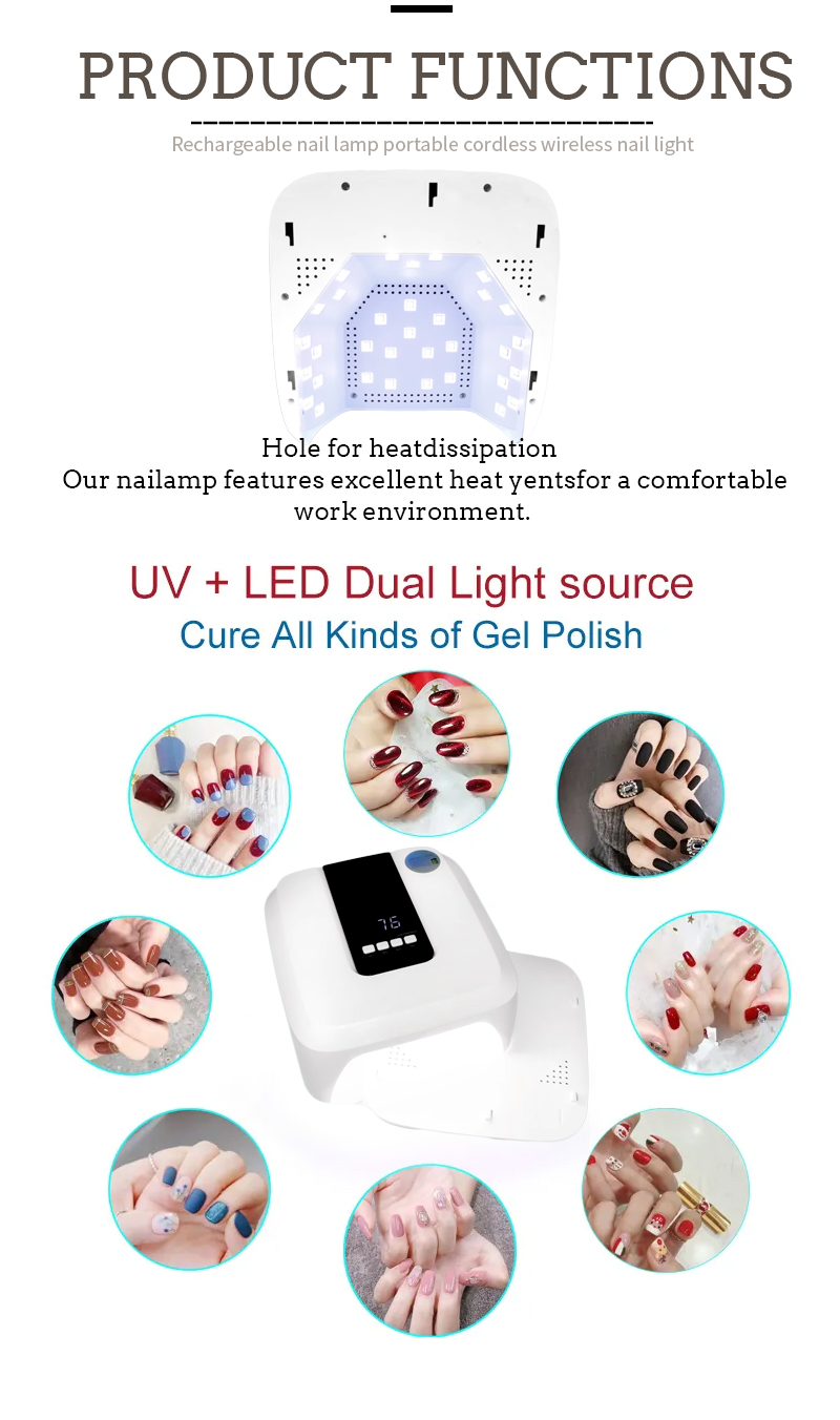 Produkten säkerställer en jämn limtorkning utan att krympa. Dess dubbla ljuskällor ger skonsam uppvärmning för att förhindra missfärgning av händerna och ansträngda ögon, lämplig för både händer och fötter, vilket ger anmärkningsvärt snabbtorkande resultat.
