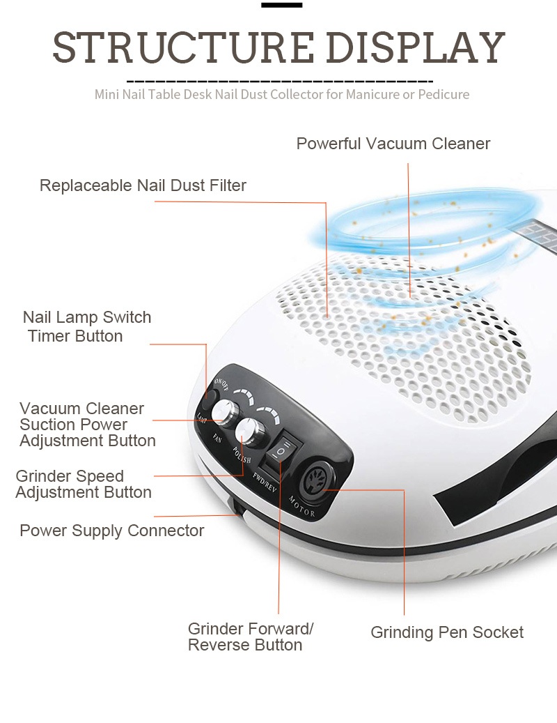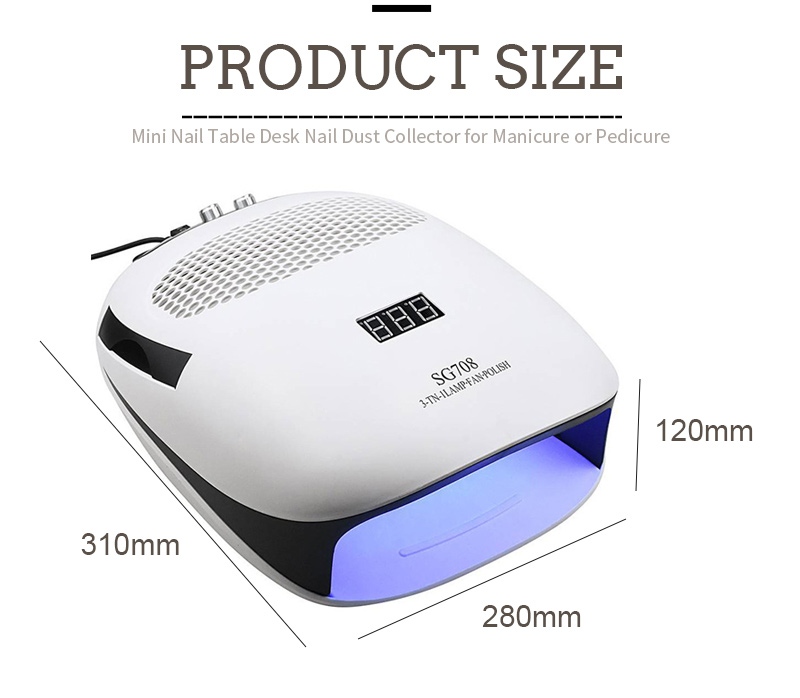 Måtten på den trippelkombinerade handhållna nagellampan med kudde är 310 mm lång, 280 mm bredd och 120 mm höjd, med stor kapacitet och möjlighet att använda både händer och fötter, vilket är mycket bekvämt.
